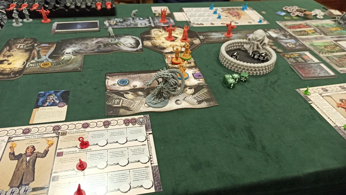 Собрались мы на первую партию впятером. Так получилось. Мне почему-то сразу показалось, что из этого ничего хорошего не получится. Сразу перед глазами стали всплывать флэшбеки из партии в ДУ на 8 человек, а на фоне боль в сердечке и нервные перекуры каждые полчаса. Никогда не забуду. Нечто подобное я ощутил и здесь. Мы проходили первый эпизод. И несмотря на то, что мы его затащили, пара человек, включая меня, погибли. А на фоне жёсткого, как мне показалось, даунтайма, первая партия мне не понравилась от слова совсем. На следующий день я всё обдумал, успокоился и решил, что надо опробовать игру меньшим составом, например, втроём. Буквально через пару недель, освежив правила в голове, мы сели проходить второй эпизод, но уже втроём, как и хотели. Древним выбрали Хастура, для разнообразия, и чтобы посмотреть, на что он способен. Условия прерывания ритуала и вообще содержание эпизодов я не буду вам спойлерить, вдруг есть особо переживающие.
