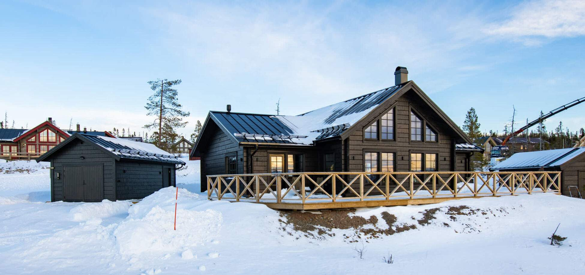 Деревянные дома с двусветным пространством, большой террасой и панорамными окнами, открывающими вид на белые просторы, — тренд строительства в поселках рядом с горнолыжными курортами. Один из таких коттеджей стоит на возвышенности, недалеко от горнолыжных трасс в Швеции. Дом выполнен из профилированного бруса и выглядит очень добротно и основательно. Внутри — лаконичный и брутальный скандинавский декор, несколько спален, большая гостиная с дровяной печью и, конечно, сауна. Из панорамных окон открывается красивый вид на заснеженные окрестности. Всё в доме располагает к отдыху после спусков и катания на лыжах, застольям и тёплому общению в кругу семьи и друзей. Снаружи стены, оконные наличники и откосы, обшивку карнизных свесов и лобовые доски покрыли антисептиком цвета темный орех. Второй свет дает гостиной много воздуха и света, а через большие окна открываются захватывающие дух виды на заснеженный пейзаж. Уют призваны обеспечить мягкие диваны и дровяная печь. Кухня с лаконичными чёрны