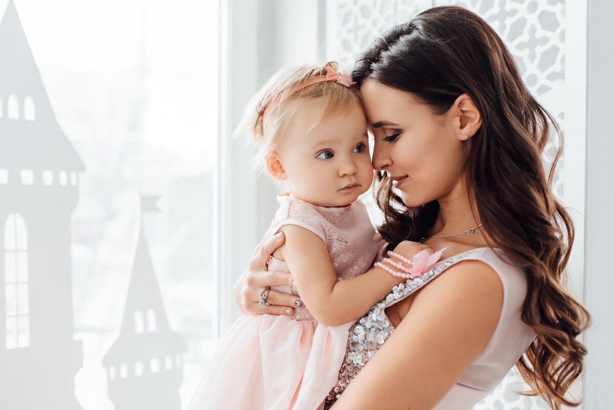Аленка сидела на диване и смотрела на Тасю, а та удивленно смотрела на маму и улыбалась.