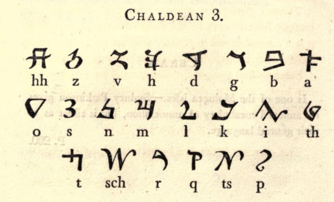 Только что упомянутый учёный римлянин предположил, что ассирийские буквы были до каких-либо исторических записей, и под этим он, несомненно, имел в виду халдейский язык: наиболее вероятно, что язык, использованный допотопными патриархами, имел наибольшую аналогию с этим, особенно когда всем разрешено, чтобы они населяли эту часть земного шара, откуда многие думали, что халдеи были до самаритянина и иврита.