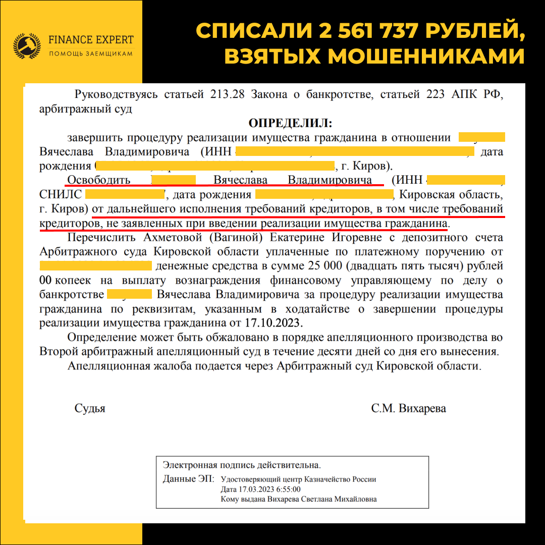Несмотря на это, мы всё равно безупречно выполнили свою работу и списали все долги Вячеслава на сумму 2 561 737 рублей