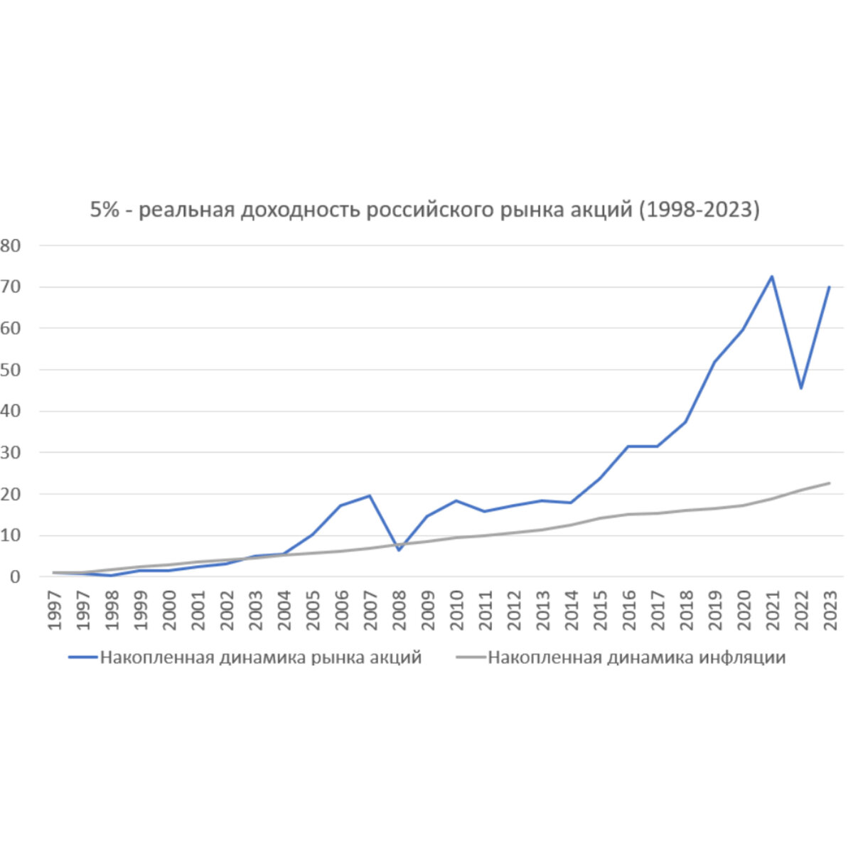 Можно ли назвать такую доходность хорошей и почему акции действительно защищают от инфляции – разбираемся в этой статье. Для оценки доходности российского рынка акций мы будем смотреть на Индекс Московской биржи полной доходности. Он учитывает дивиденды, которые выплачивают компании, входящие в индекс, поэтому Индекс полной доходности более правильно показывает результат инвестиций. Обычный индекс Московской биржи — ценовой, то есть отражает только рост цен акций. Индекс Московской биржи рассчитывается с сентября 1997 года, то есть на сегодняшний день у нас есть динамика за 26 полных лет, с начала 1998 года до конца 2023 года. Начальное значение индекса 100 пунктов, на конец 2023 года индекс Московской биржи был примерно 3100 пунктов, индекс Московской биржи полной доходности был примерно 7000 пунктов. То есть более чем в 2 раза выше, эта разница и есть эффект выплаченных дивидендов. Таким образом, если мы смотрим на динамику рынка за эти 26 полных лет, получается, что среднегодовая до