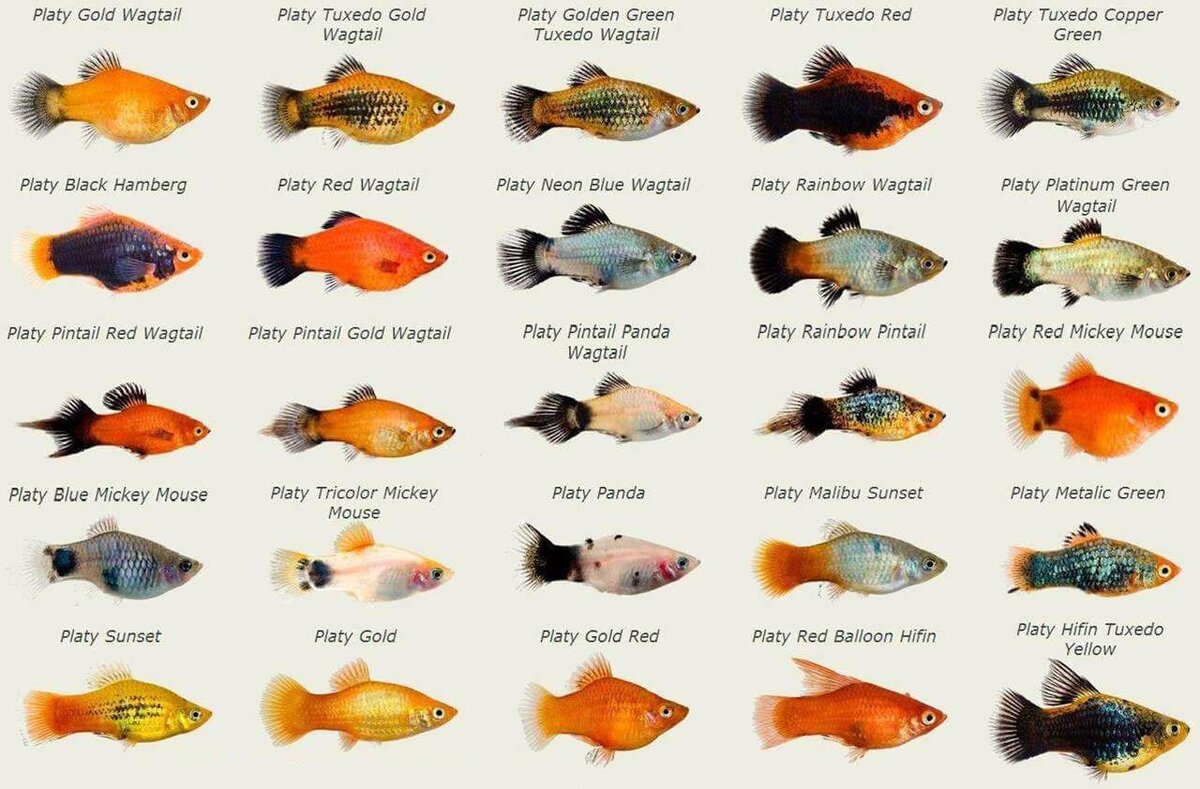 Все многообразие окрасов и форм современных пецилий – результат длительной селекции. Возможность скрещивания с меченосцами также позволило создать большое количество гибридов.