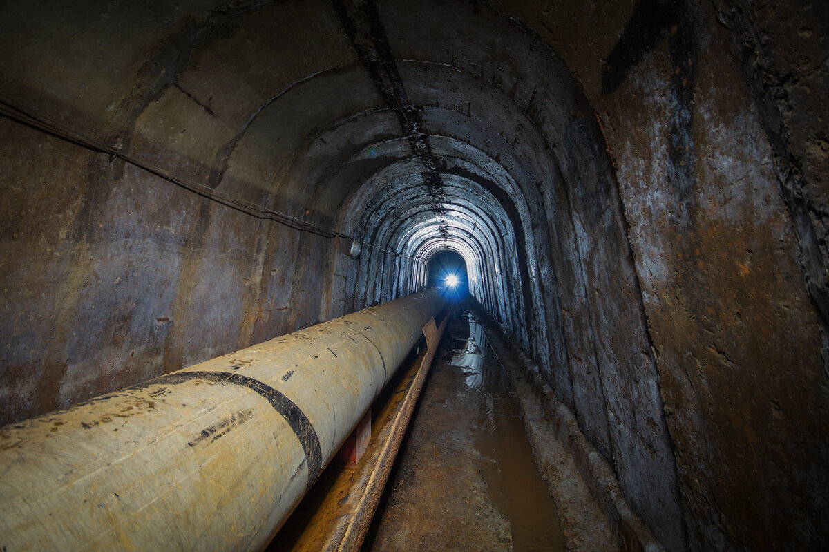 Сегодня речь пойдёт о довольно приятном тоннеле, который берёт своё начало в парке Минного городка. Через ничем не примечательный люк в парке мы спускаемся с плавящейся от 30 градусной жары поверхности города на глубину около 8 метров, где сразу же обдает приятной прохладой, температура здесь стабильна и почти не отличается зимой и летом. Пока из рюкзаков выгружается оборудование для освещения и съёмки глаза успевают привыкнуть к темноте, а кожа к прохладной влажности подземелья. Мы оказались в камере размещения запорной арматуры. Здесь трубы выходят из стены, по видимому дальше они идут по не проходным бетонным каналам и уходят в противоположном направлении в тоннель. Нам туда же. Вступаем из камеры в прямой тоннель длинной в 1100 метров, который начинается в Ленинском районе города, а заканчивается уже в Первореченском. Тоннель выполнен закрытым способом и пронизывает насквозь сопку. В качестве крепи использовались арочные железобетонные конструкции. Точными сведениями о перио