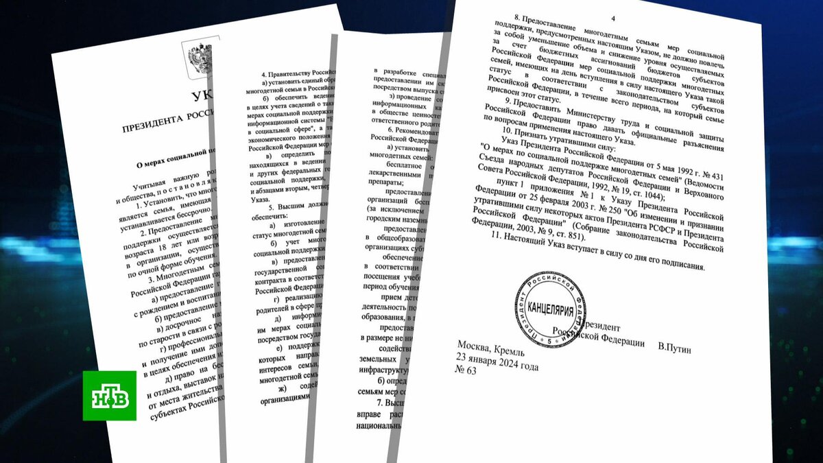 [ Смотреть видео на сайте НТВ ] Владимир Путин своим указом гарантировал многодетным семьям оказание мер социальной поддержки. Статус многодетных семей и меры поддержки для них теперь закреплены на федеральном уровне. Указ подписан Владимиром Путиным и уже опубликован на портале правовой информации. Согласно документу, многодетной считается семья с тремя и более детьми. Льготами могут пользоваться, пока старшему ребенку не исполнится 18 лет или 23, если он студент дневной формы обучения. Кабмину поручено установить единый образец удостоверения многодетной семьи для всех регионов. Ранее в России не было единого подхода к определению такого статуса, он не закреплялся законодательно. Регионы были вправе самостоятельно оговаривать критерии. Наступивший 2024 год объявлен Годом семьи. Торжественная церемония открытия пройдет сегодня на ВДНХ в рамках всероссийского семейного форума «Родные — Любимые». Как ожидается, участие в мероприятии примет Владимир Путин. [ Смотреть видео на сайте НТВ ]