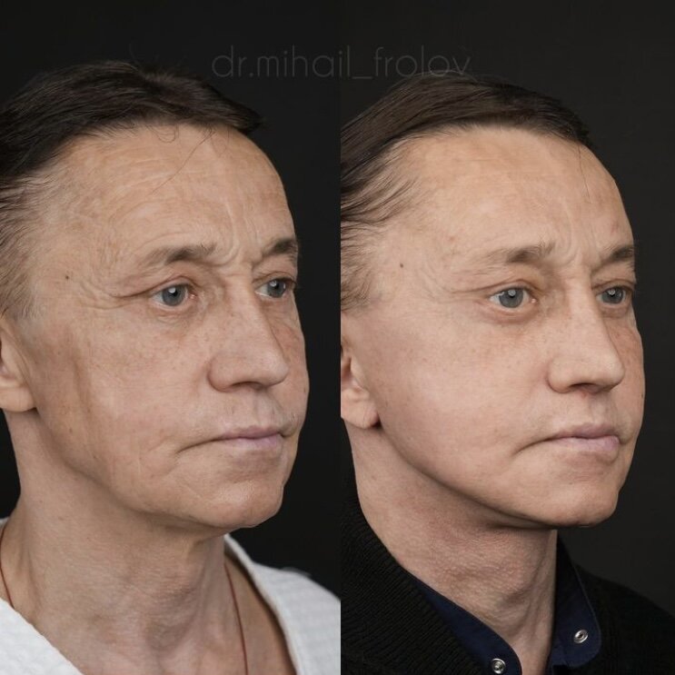 Причём, подпись хирурга меня тоже удивила: мол, важно чтоб результат был естественный и незаметный, вот как здесь. Ну да, очень естественно и очень незаметно.. Действительно, правые фото (после подтяжки) не отличить от фото реальных 35-летних мужчин.. Хотя пациент, наверняка, доволен и счастлив (и это главное), просто на этом примере хочу (снова и опять, опять и снова)) поговорить о важном. Мне интересно: люди правда считают, что после такого преображения они ДЕЙСТВИТЕЛЬНО выглядят так же, как молодые мужчины 35-40 лет, которые просто следят за собой (и хорошо выглядят)? То есть, достаточно натянуть лицо у хирурга, чтобы на равных конкурировать с молодыми мужчинами? Просто представьте, что вы видите вот такое «чудо преображения» (правое фото ниже) на сайте знакомств с подписью: «Иван, 35 лет». И вы ДЕЙСТВИТЕЛЬНО поверите в то, что Ивану 35 лет? Или вы подумаете нечто другое? 😏🤡