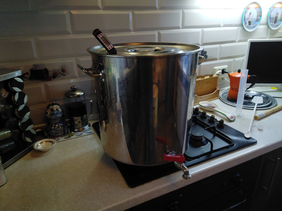 Моя первая варка пшеничного пива. Состав: 1. Солод Пшеничный - 3 кг., 2. Солод ячменный Венский - 2,5 кг., 3. Солод Мюнхенский - 0,5 кг. Всего 6 кг. Вода - 21 литр на затирание и 16 на промывку. Рецепт: 1. Пауза 55 градусов - 20 минут, 2. Пауза 63-67 градусов - 40 минут, 3. Пауза 71-73 градуса - 20 минут, 4. Пауза 78 градусов - 5 минут Варка -75 минут. Хмель: 1. Традиционный - 15 гр. - 60 минут варки, 2. Традиционный - 15 гр. - 20 минут, 3. Сааз - 20 гр. - 5 минут. Варка прошла нормально, но фильтрация после затирки со скрипом, пшеничный солод не очень хорошо фильтруется. Надо провести апгрейд фитрсистемы, или базуку взять подлиннее, это такая фильтрнасадка на сливной кран, или поставить фальшдно. Плотность начальная получилась -14%. Сбраживать планировал дрожжами "Своя кружка" для пшеничного пива, но произошел конфуз. Сами дрожжи были староваты, у них срок годности 1,5 года и по идее оставалось ещё пара месяцев, но они не завелись даже через 1,5 суток после внесения, пришлось вносит