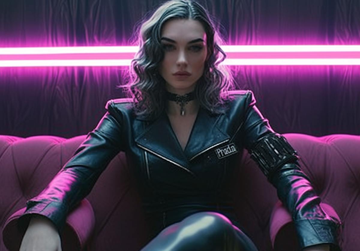 Описание сцены, например: девушка в кожаном облегающем костюме сидит на розовом диване и смотрит томным взглядом в камеру.