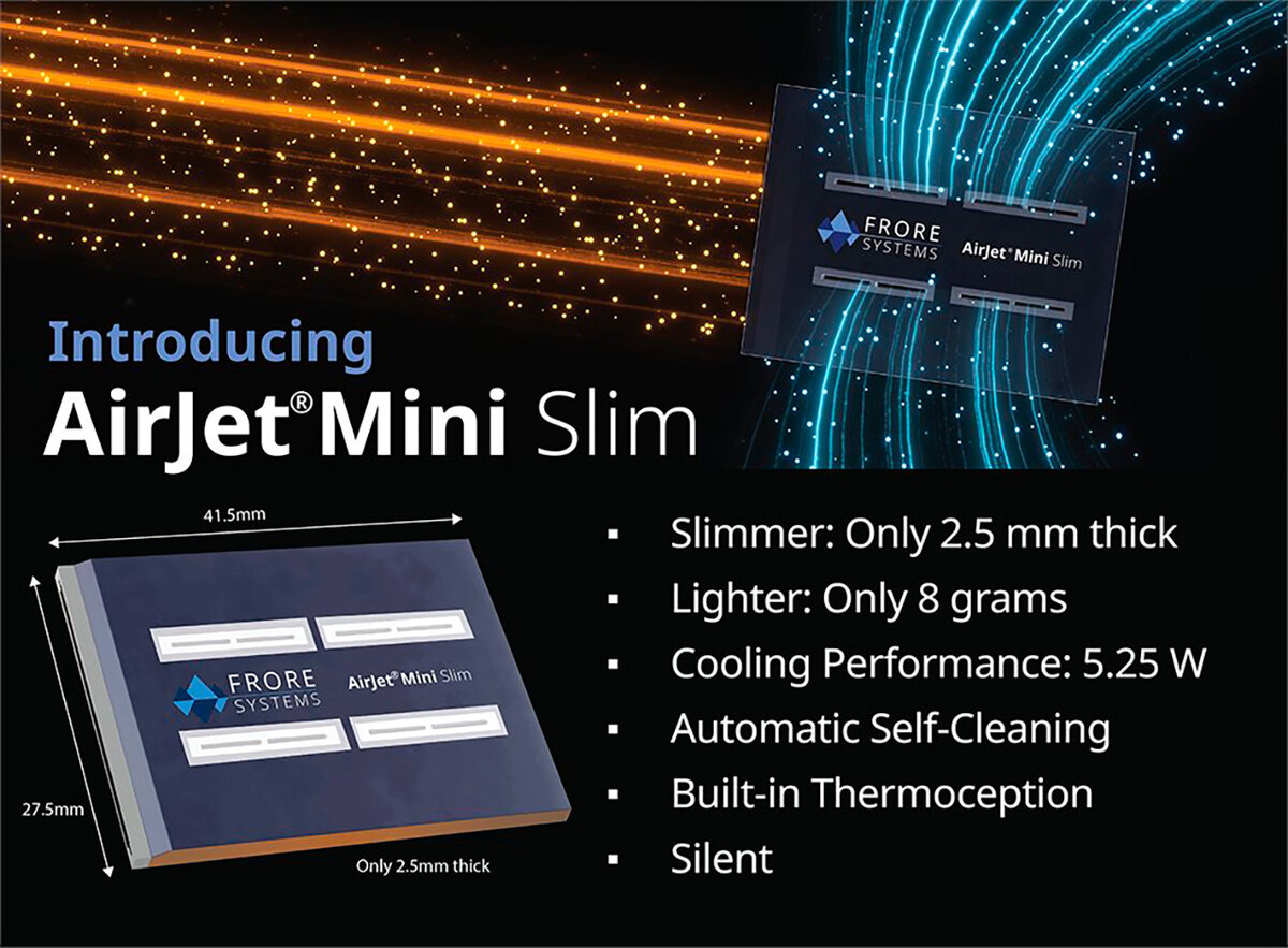 CES 2024 богата на различные экзотические системы охлаждения, и вот ещё одна. Frore Systems представила новую версию сверхкомпактного кулера AirJet Mini, где для охлаждения используется ультразвук. Инновационной подход уже свою жизнеспособность в MacBook Air и мини-ПК Zotac. Новая версия не уступает оригинальной, по-прежнему может рассеять 5,25 Вт тепловой мощности, но стала ещё меньше – 27,5x41,5x2,5 мм. Второе важное улучшение – функция самоочистки. Направление воздушного потока меняется на обратное, скопившаяся в фильтрах пыль вылетает. 2,5 мм толщины позволяют использовать AirJet Mini Slim в тонких ноутбуках, планшетах, смартфонах, различных портативных игровых приставках, и даже SSD-накопителях. Продемонстрировали плату с 4х Crucial T700 2 ТБ (быстрые PCI-E 5.0 SSD), которую охлаждали 4x модуля AirJet Mini Slim. Накопители не троттлили, но «на тоненького» – по 76-79 градусов. Справедливости ради, квартет таких SSD выделяет под 50 ватт тепла, а модули рассчитаны на 21 Вт суммарно.