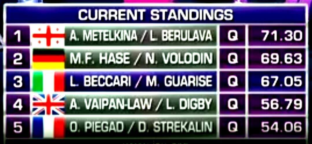Ни одна пара не преодолела двухсот балльный барьер. Итальянцам не хватило до него менее 1 балла. При чистом прокате Метелкина/Берулава вполне могли это сделать. Но как получилось - так получилось.