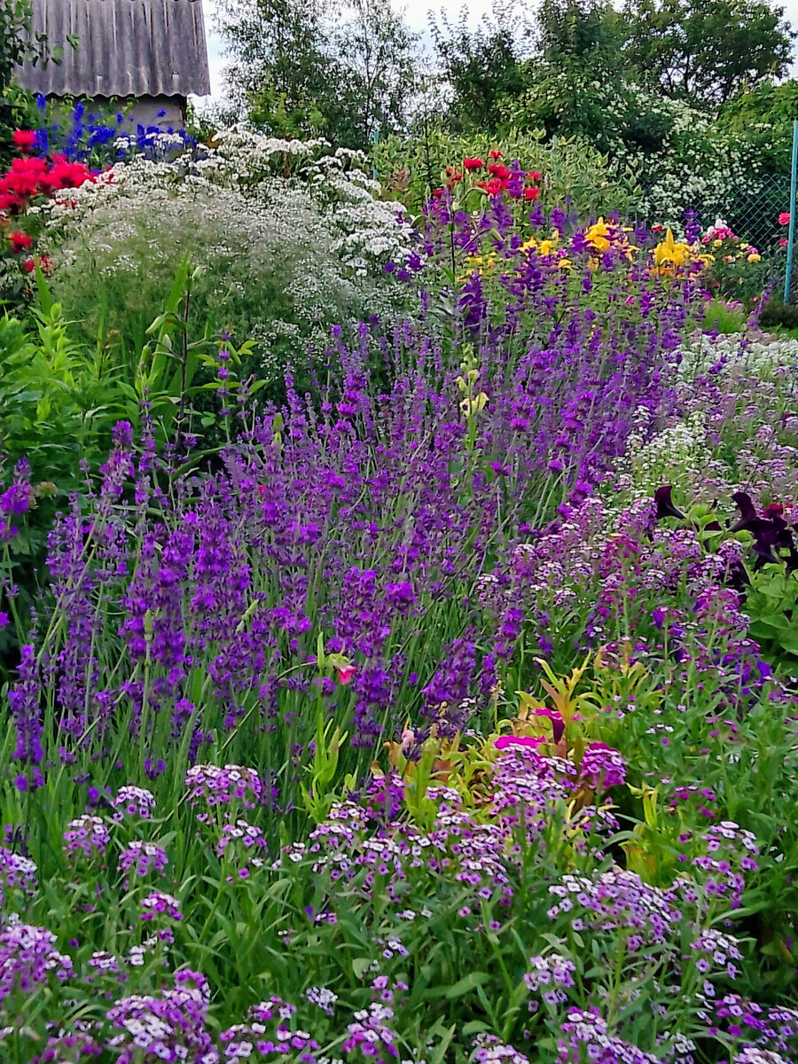 Приветствую вас, друзья мои! Сейчас в Дзене прям бум на показ синего, наверное потому что в природе не так много этого цвета. Вот и я решила принять эстафету, или как сейчас это принято называть, флешмоб и показать свою синеву. Наверное многие мои читатели знают, что я очень люблю лаванду и её у меня не мало, если можно так сказать, это моя визитная карточка. Ну и начнем с весны, конечно добавим немного голубого, а может и сиреневого. Первая синева в моем саду начинается с самых простых мускарей. А эти махровые, цветут немного позже, принесла я их в свой сад от храма, там их много. Ну вот как он тут оказался, вопрос ? Первоцветов у меня мало, среди голубеньких имеется самая простая брунерра. Вот все пишут, что она агрессивна, а моя ну никак не хочет разрастаться и цветет так себе. Флокс растопыренный, он конечно не синий, он как небо, голубой, вот только телефон немного искажает цвет. Шалфей луговой, вот его я убрала, не понравился, листья большие, цветочки мелкие , а самое гла