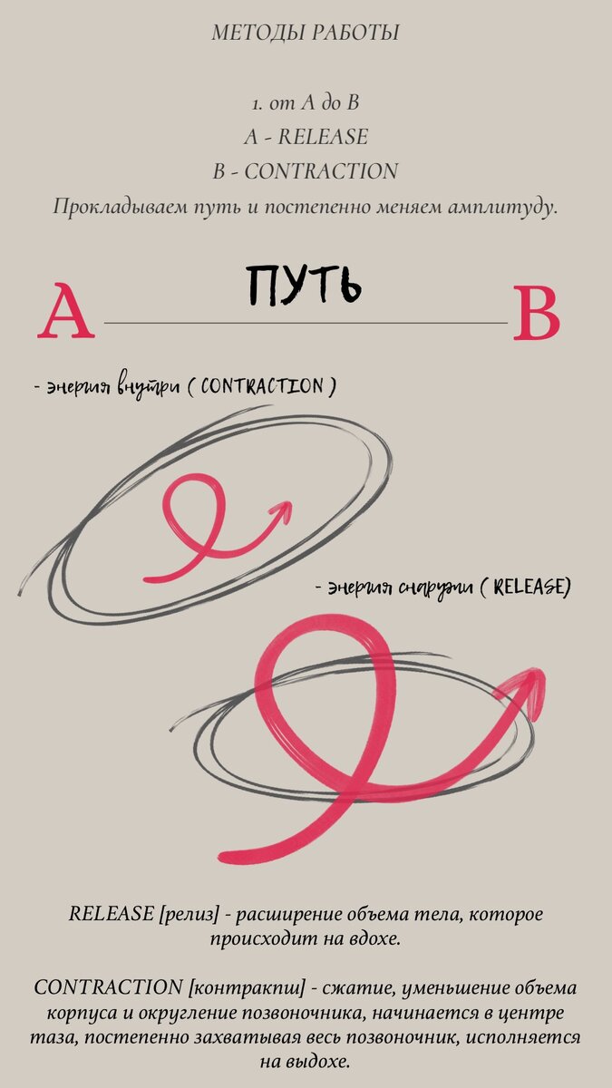 Узнать возможности своего тела — это один из ключей познания в искусстве хореографии. Материал с которым мы можем работать самостоятельно и находить новое — даёт нам открытие безграничного и прекрасного. Ключи к развитию собственного почерка танцора: ОБЪЁМ/АМПЛИТУДА max широкие и max узкие точки ⁃ это наши конечности, которые мы можем максимально растянуть или работать через силу в узкой амплитуде ИСПОЛЬЗУЕМ МЕТОД: RELEASE [релиз] - расширение объема тела, которое происходит на вдохе. CONTRACTION [контракпш] - сжатие, уменьшение объема корпуса и округление позвоночника, начинается в центре таза, постепенно захватывая весь позвоночник, исполняется на выдохе. 1. работа может происходить ВНУТРИ/СНАРУЖИ суставов 2. узкий объём = большей работе мышц ( работа через напряжение ) 3. широкий объём = потоку ПРИЁМЫ: 1. от А до В A - RELEASE B - CONTRACTION Прокладываем путь и постепенно меняем амплитуду. ТРАЕКТОРИЯ 1. ДВИЖЕНИЕ СЛИТНОЕ-путь движения происходит без остановок 2. ДВИЖЕНИЕ ПРЕРЫ