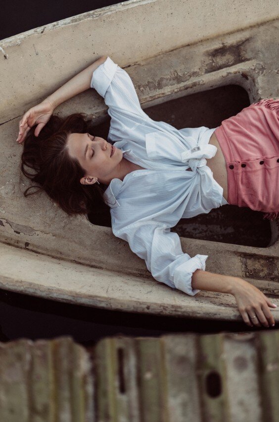 Однажды я сделала фотосессию на очень печальной лодке. Печальной, потому что состояние ее было сильно запущенным, к тому же все дно было в мелких дырах, она протекала. Но настоящую женщину ничто не остановит ради красивых фотографий.