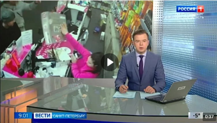 Сюжет программы "Вести. Санкт-Петербург" (телеканал "Россия 1") об инциденте в торгово-развлекательном комплексе на Байконурской улице, где один из посетителей, вступивший в конфликт с женщиной-кассиром, был задержан нарядом районного отдела вневедомственной охраны.