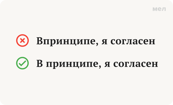 Многим из вас наверняка покажется, что ответ на этот вопрос очевиден, однако данные поисковых систем доказывают обратное: судя по количеству запросов, это одна из самых распространенных ошибок. Правильно: В принципе, я согласен На самом деле, все очень просто: «в принципе» — это сочетание предлога и существительного, которое всегда пишутся раздельно. Из-за того что эта конструкция может выполнять в предложении как роль вводного выражения, так и обстоятельства, ее можно принять за наречие. Но это не так: когда сочетание «в принципе» выступает в роли обстоятельства, оно становится наречным выражением, то есть ведет себя как наречие, при этом по-прежнему оставаясь предлогом с существительным. Одним словом, запоминайте: сочетание «в принципе» всегда пишется раздельно. И никак иначе. Еще больше веселых и полезных карточек о русском языке — в «Грамотности» на «Меле» во «ВКонтакте». Подписывайтесь, чтобы всегда говорить и писать правильно! Иллюстрация: Anton Vierietin / Shutterstock / Fotodom