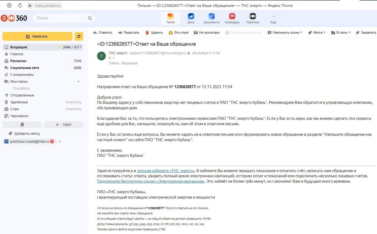 Обращение в Генеральную прокуратуру РФ по факту полного отсутствия клиентоориентированности техподдержки ПАО «ТНС энерго Кубань»