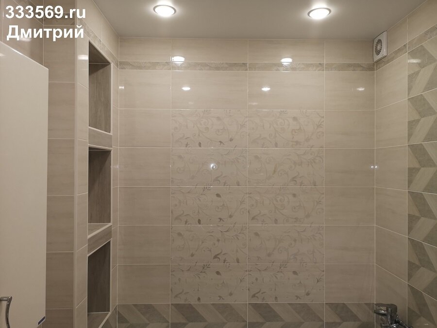 Установлен вытяжной вентилятор. Сделаны краны и розетка для бойлера. Раскладка плитки - симметричная.