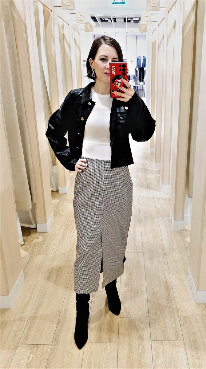 Я неоднократно писала, что стильные образы можно собрать в любом сегменте - от масс-маркета до люкса, главное знать, что выбирать. Сегодня хочу еще раз это подтвердить, показав комплекты, которые выглядят здорово, но не требуют значительных финансовых затрат. Образ 1 Берем юбку миди в гусиную лапку, дополняем белым лонгсливом по фигуре и укороченным жакетом из экокожи - и получаем красивые пропорции. По обуви: на зиму, начало весны лучше всего подойдут сапоги, заходящие под подол юбки, на более теплое время - черные балетки или лодочки с полупрозрачными черными колготками. Артикулы и цены: юбка - LD1552O02-T7, 1399 руб. (было 2 799), жакет - LB1552O02-99, 1999 руб. (было 2 999), лонгслив - LT461AO02-01, 1399 руб. На мне юбка в размере S (хотелось бы бы ХS, но не было), остальное - в размере ХS Образ 2 Темно-синие брюки в полоску - очень модная вещь, несмотря на кажущуюся простоту. Дополним их чуть свободным джемпером - и получим стильный образ, который уместен и в офисе, и за его пред