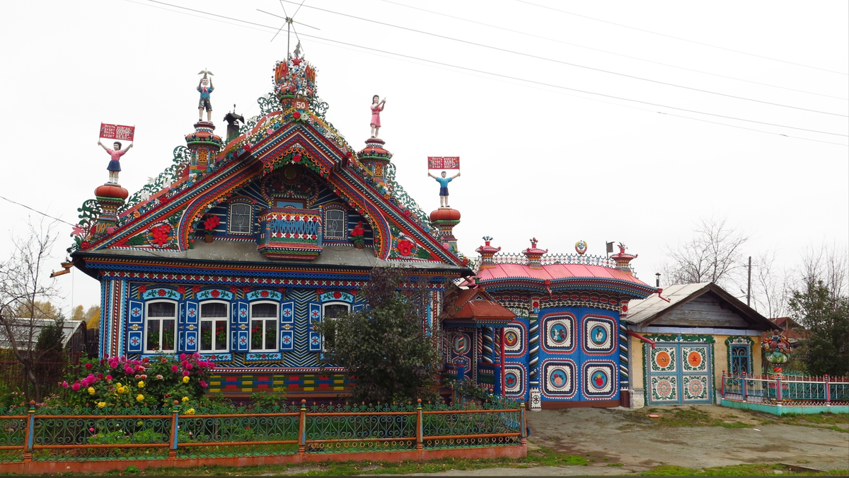 К «наивному стилю» в искусстве обычно относят нарочито непрофессиональную живопись, скульптуру, всяческое декоративно-прикладное творчество. А может ли быть наивной архитектура? Да запросто! Кунара – обычное уральское село в 20 км от Невьянска. Сто лет назад там жило больше тысячи человек, сейчас – едва полторы сотни. Но нас интересует один: кузнец Сергей Кириллов. Родился он в 1930 г., так что юность у него была отнюдь не «сахарная». Война оборвала его образование на трёх классах, на фронте погиб отец – повзрослел Серёжа рано. Несмотря на удары судьбы, он остался добрым и творческим человеком, душой компании, непременным гармонистом на сельских свадьбах. А ещё он, похоже, непоколебимо верил в светлое будущее. От отца Кириллову достался деревенский дом – большой, старинный и изрядно обветшалый. Жизнь пришла в относительную норму, в 1951 г. новый хозяин женился и три года спустя взялся за ремонт своего жилища, решив заодно добавить ему ярких красок… и уже не смог остановиться. Работа «о