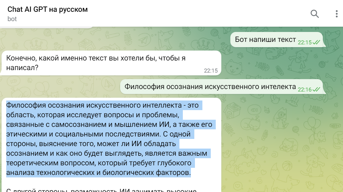 Выше представленный отрывок был написан чат-ботом по моему запросу и никто бы никогда не узнал об этом, если бы я не призналась в это.