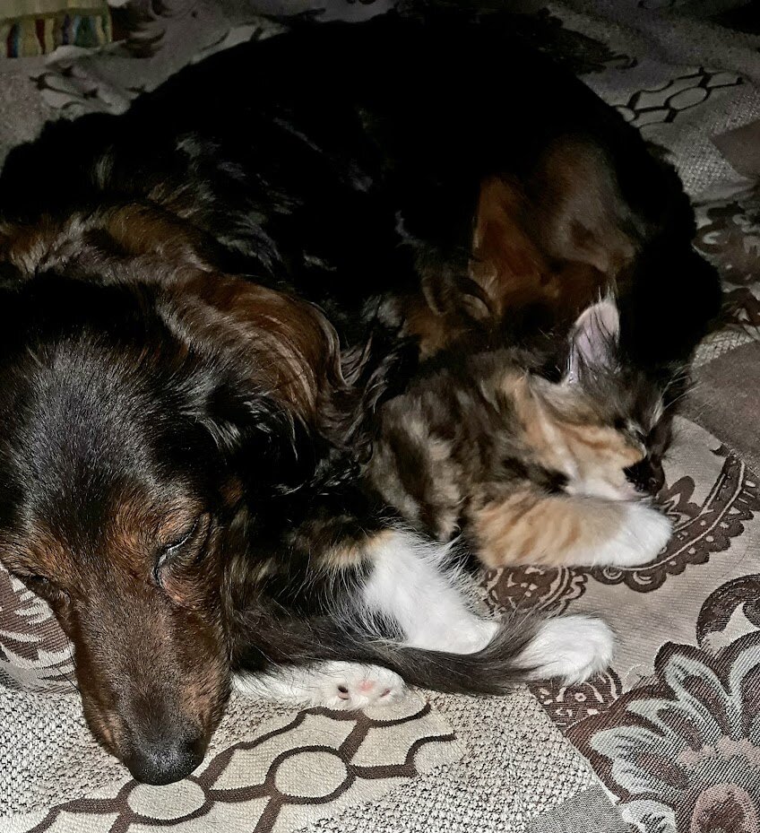 Пока таксик гулял киса вышла из укрытия и стала осматривать всё вокруг. Неуклюже двигаясь на маленьких лапах и неустанно повторяя: «Миу-миу!». А стоило Оскару вернуться домой, она опять спряталась в сумку. А пёс лёг радом с отрытой дверцей переноски и стал ждать. Маленькая кошка решила изучить неведомого зверя (собак она до этого не видела никогда). Осторожно коснулась белой лапкой его носа, потом поиграла пёсь