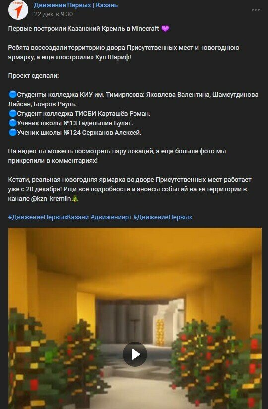 Итак, начнем сначала. 22 декабря в VK сообществе «Движение Первых | Казань» был опубликован пост, в котором заявлялось, что группой студентов и школьников была воссоздана территория двора Присутственных мест, новогодняя ярмарка, а еще «построен» Кул Шариф.