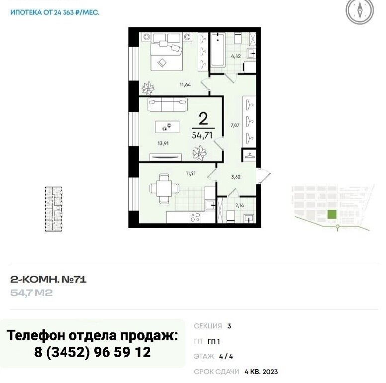 Квартира 54,71 кв.м. ПВ - 20,1% (1 348 107 р) Ставка по семейной ипотеке: 3,5% Ежемесячный платёж: 24 063,84 р Запись на просмотр и подача заявки на ипотеку по телефону: 8(3452)965912
