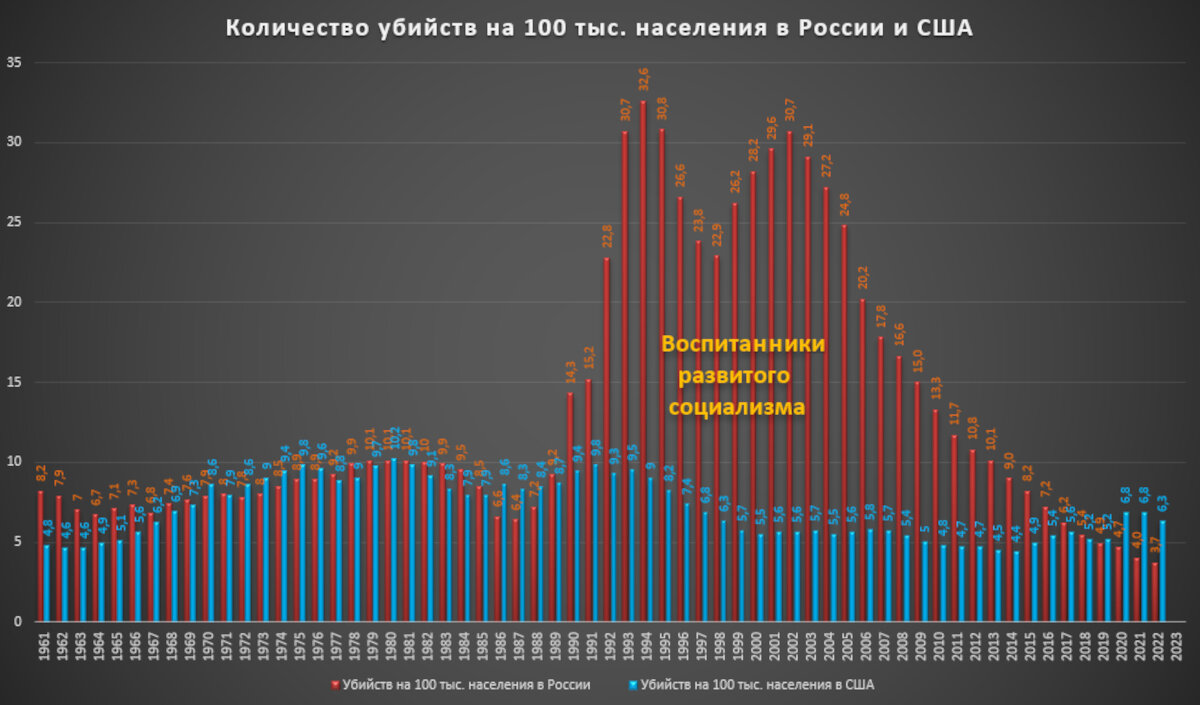 1. США сильно опережают современную Россию по уровню убийств — как минимум в полтора раза, если считать на 100 тысяч человек. При этом в некоторых регионах России — в Чечне, к примеру, — уже в разы безопаснее, чем в Америке. Цитирую (ссылка): Резкий ковидный скачок убийств на 30% поставил точку в споре, где безопасней гулять ночью.