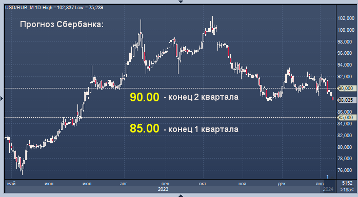 SberCIB ссылается на временный характер мер по обязательной продаже выручки экспортерами Курс доллар/рубля на Мосбирже интервалами в 1 минуту Курс доллар/рубля на Forex интервалами в 4 часа Рубль может укрепиться до уровня 85 руб./$1 в конце первого квартала текущего года, при этом он может вернуться к отметке 90 руб./$1 во втором квартале, пишет стратег SberCIB Investment Research Юрий Попов. "Рубль получит поддержку в начале 2024 года благодаря решению ЦБ по продаже валюты и действию указа об обязательной продаже валютной выручке экспортерами (в итоге предложение валюты от экспортеров и ЦБ будет существенным - около $27-28 млрд в месяц; это выше, чем объемы предложения на протяжении большей части прошлого года). По нашим прогнозам, национальная валюта может укрепиться до 88 руб./$1 в январе и 87 руб./$1 в феврале. По-прежнему считаем, что в конце 1К24 рубль может укрепиться до 85 руб./$1, поскольку ждем восстановления товарного экспорта и цен на нефть.При этом мы сохраняем прогноз, к