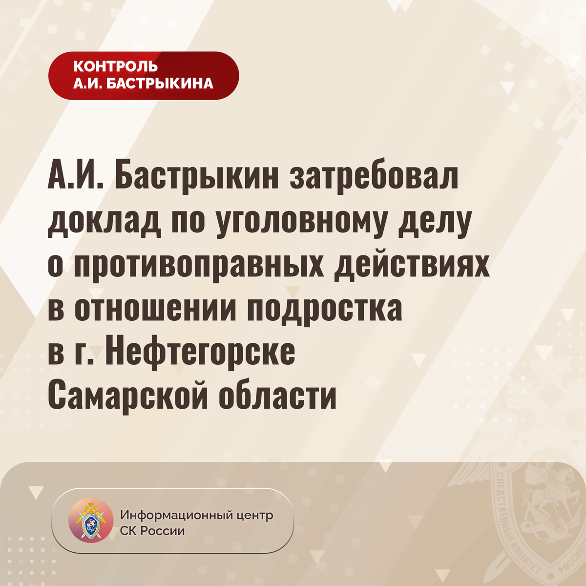 Председатель Следственного комитета Российской Федерации Александр Иванович Бастрыкин затребовал у и.о. руководителя СУ СК России по Самарской области Алексея Ивановича Колбасина доклад о ходе и р