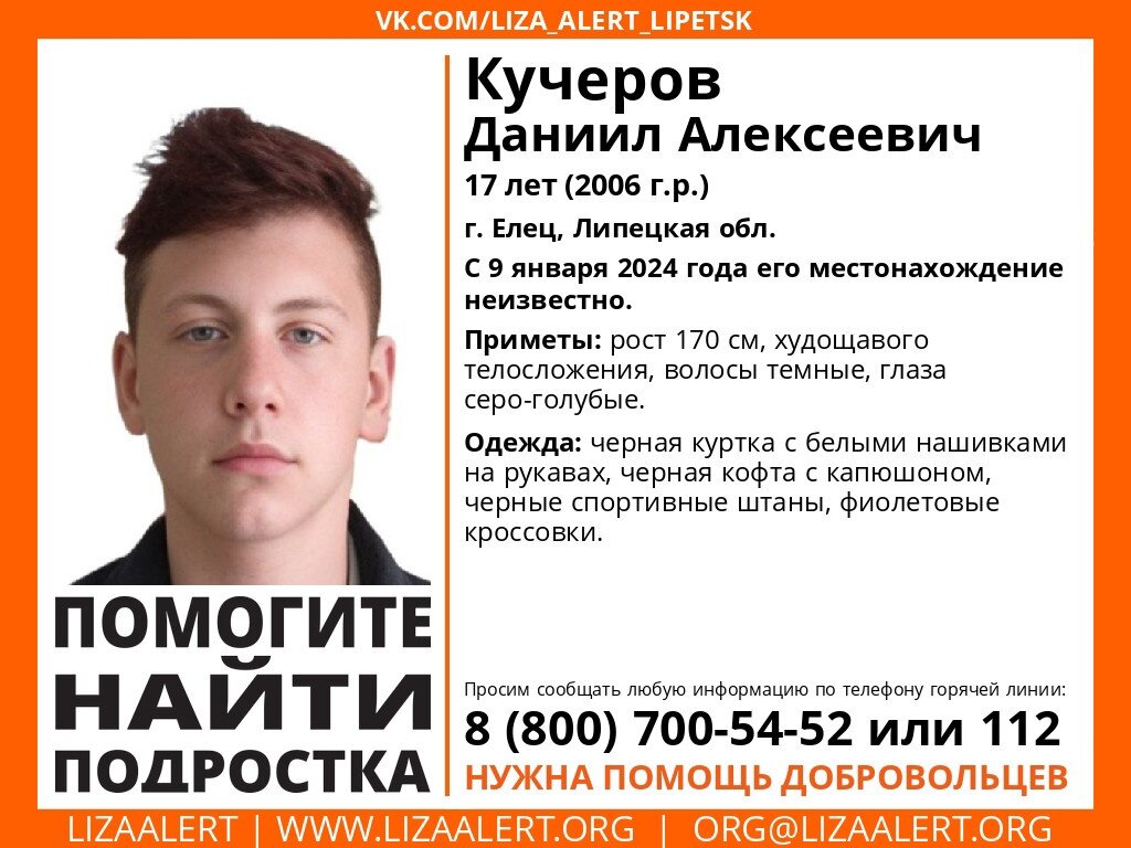 В Липецкой области ищут пропавшего в Ельце 17-летнего подростка Даниила Кучерова. Об этом сообщает региональный поисковый отряд «Лиза Алерт». О его местонахождении ничего не известно с 9 января. По данным ЛООО «Поиск пропавших детей», подростка последний раз видели в районе улицы Ростовской в Ельце около 15:30. — Нужна помощь добровольцев, — написали поисковики. Приметы пропавшего: рост 170 сантиметров, худощавое телосложение, темные волосы и серо-голубые глаза. Одежда пропавшего: черная куртка с белыми нашивками на рукавах, черная кофта с капюшоном, черные спортивные штаны и фиолетовые кроссовки. Всех, кто что-нибудь знает о местонахождении пропавшего, просят сообщать по телефонам 8 (800) 700-54-52 или 112.
