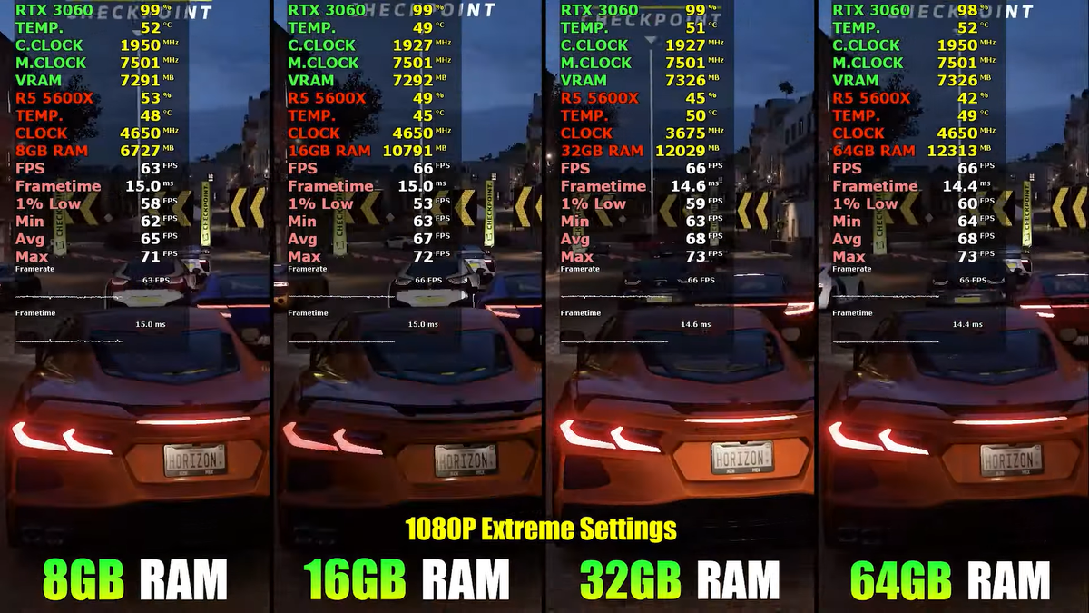 Эксперты YouTube-канала PC Support & Gaming Test узнали, чего стоит ожидать в современных играх в Full HD от оперативной памяти объёмом 8, 16, 32 и 64 ГБ. В игре Forza Horizon 5 с графикой Extreme удалось в среднем получить 68 к/с (8 ГБ), 70 к/с (16 ГБ), 71 к/с (32 ГБ) и 71 к/с (64 ГБ). Alan Wake 2 на настройках графики High с 8 ГБ ОЗУ не запустилась вообще. При этом с 16, 32 и 64 ГБ оперативной памяти в среднем частота кадров составляла 28 к/с. Cyberpunk 2077 шла с Ray Tracing Ultra Preset, DLSS Quality. Средний FPS в ней находился на уровне 47 к/с (8 ГБ), 49 к/с (16 ГБ) и 50 к/с (32 и 64 ГБ). В Assassin's Creed Mirage с настройками графики Ultra High средняя производительность составляла 81 к/с (8 ГБ), 87 к/с (16 ГБ и 32 ГБ), 88 к/с (64 ГБ). В The Last of Us Part 1 с ультра-пресетом с 8 ГБ ничего не удалось получить (она просто не запустилась). С 16 ГБ ОЗУ средняя частота кадров составляла 49 к/с, с 32 и 64 ГБ - 48 к/с. Resident Evil 4 Remake тестировалась с Raytracing Preset. Средни