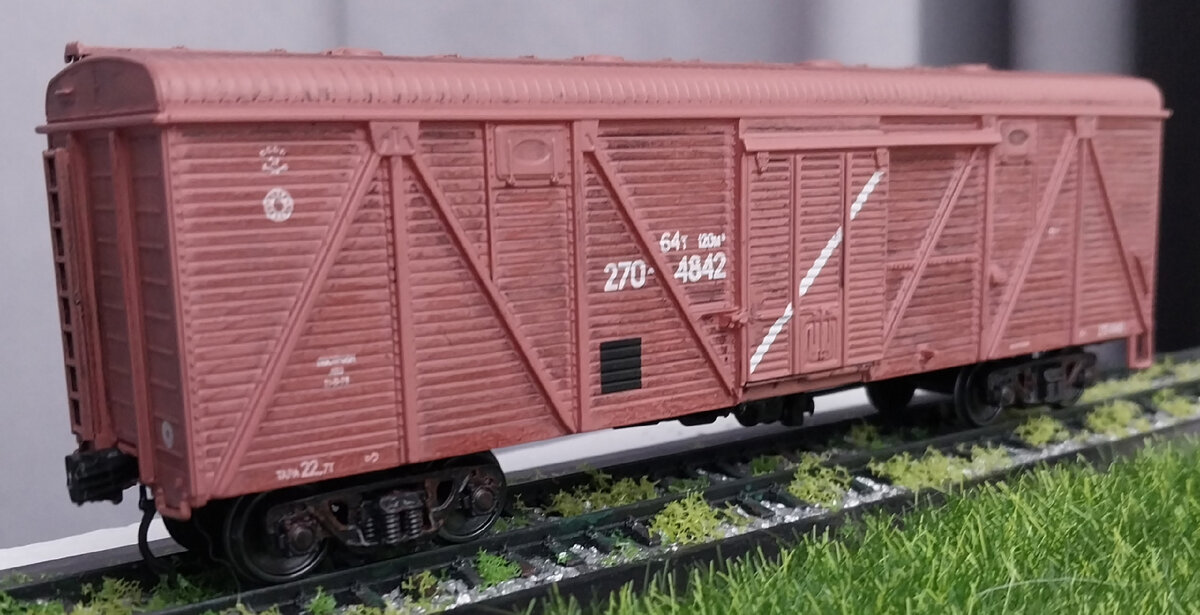Состаренная версия вагона с доработками. У модели заменены пластиковые колёсные пары на металлические, установлены кронштейны приводов расцепления от ArtModel, заменены поручни из проволоки, на более тонкие.