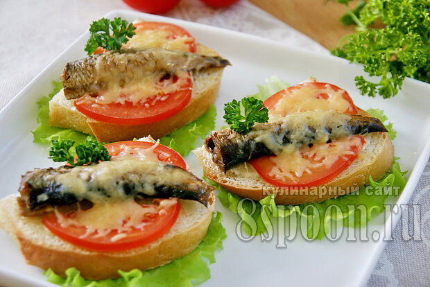 Как приготовить закусочные бутерброды на праздничный стол со шпротами помидорами и сыром в духовке, вы можете посмотреть ЗДЕСЬ.