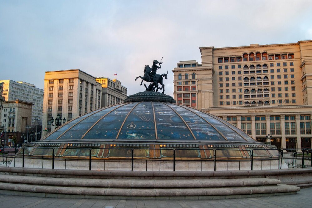 Существует легенда, что Москву охраняют рыцари, которые появились на фасадах домов примерно в одно время. Они, как часовые, присматривают за городом. Самым главным хранителем города (1) является конечно же Георгий Победоносец, чья самая центральная скульптура находится на Манежной площади, на Часах мира. Фонтан "Часы мира" установлен в 1997 году, скульптор З. Церетели (метро Охотный ряд): Какие же рыцари охраняют Москву? Конечно же, самые известные, расположенные на доходных домах, построенных в 1910-1914 годах: Самый северный. Доходный дом Анны Шугаевой (2), Садовая-Самотёчная, 2/12 (метро Цветной бульвар), архитектор Василий Никанорович Волокитин, 1913-1914, северный модерн с элементами неоготики : Самый южный. Доходный дом купца 1-й гильдии, владельца крупного кожевенного завода Якова Марковича Демента (3), Большая Полянка, 54 (метро Добрынинская), архитектор В. Е. Дубовской при участии Л. Б. Горенберга, оформление интерьеров – художник–декоратор Игнатий Игнатьевич Нивинский, 1910-