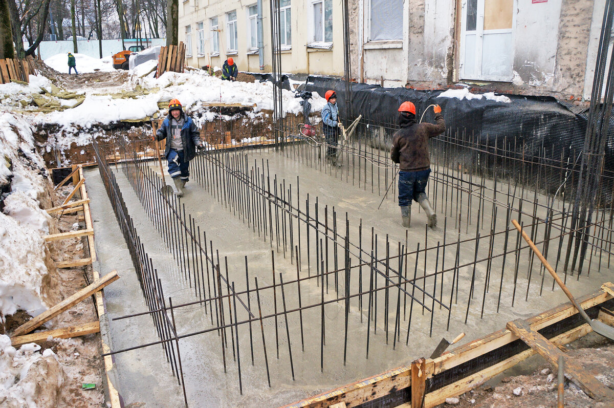 Кроме того, уже залито порядка 80% новых плит перекрытия, выполнены в монолите. Работы продолжаются. Над подвалом режем плиты под новый вход для персонала и тепловые узлы (в подвале будут находится бытовые помещения). Проложены наружные вводы в задние, началась разводка канализационных систем.