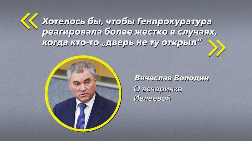 Генпрокуратуре России следовало отреагировать на «голую» вечеринку в Москве жестче. Председатель Госдумы Вячеслав Володин заявил об этом на торжественном заседании в честь Дня работника прокуратуры, сообщило РИА «Новости». «Хотелось бы, чтобы Генеральная прокуратура в случаях, когда кто-то „дверь не ту открыл“, реагировала более жестко», — заявил он. Вячеслав Володин сказал, что такие вечеринки перечеркнули ценности российского общества. Он призвал реагировать на такие случаи и защищать страну. Спикер Госдумы процитировал заявление певца Филиппа Киркорова, который объяснил свое появление на «голой» вечеринке в клубе «Мутабор». Артист заявил, что в жизни каждого бывали моменты, когда они входили не в ту дверь. Он сказал, что безответственно отнесся к участию в этом мероприятии. Организатора праздника — блогера Анастасию Ивлееву оштрафовали на 100 тысяч рублей за нарушение правопорядка. Она не признала свою вину. Суд отказался блокировать ее YouTube-канал и отклонил миллиардный иск от ар