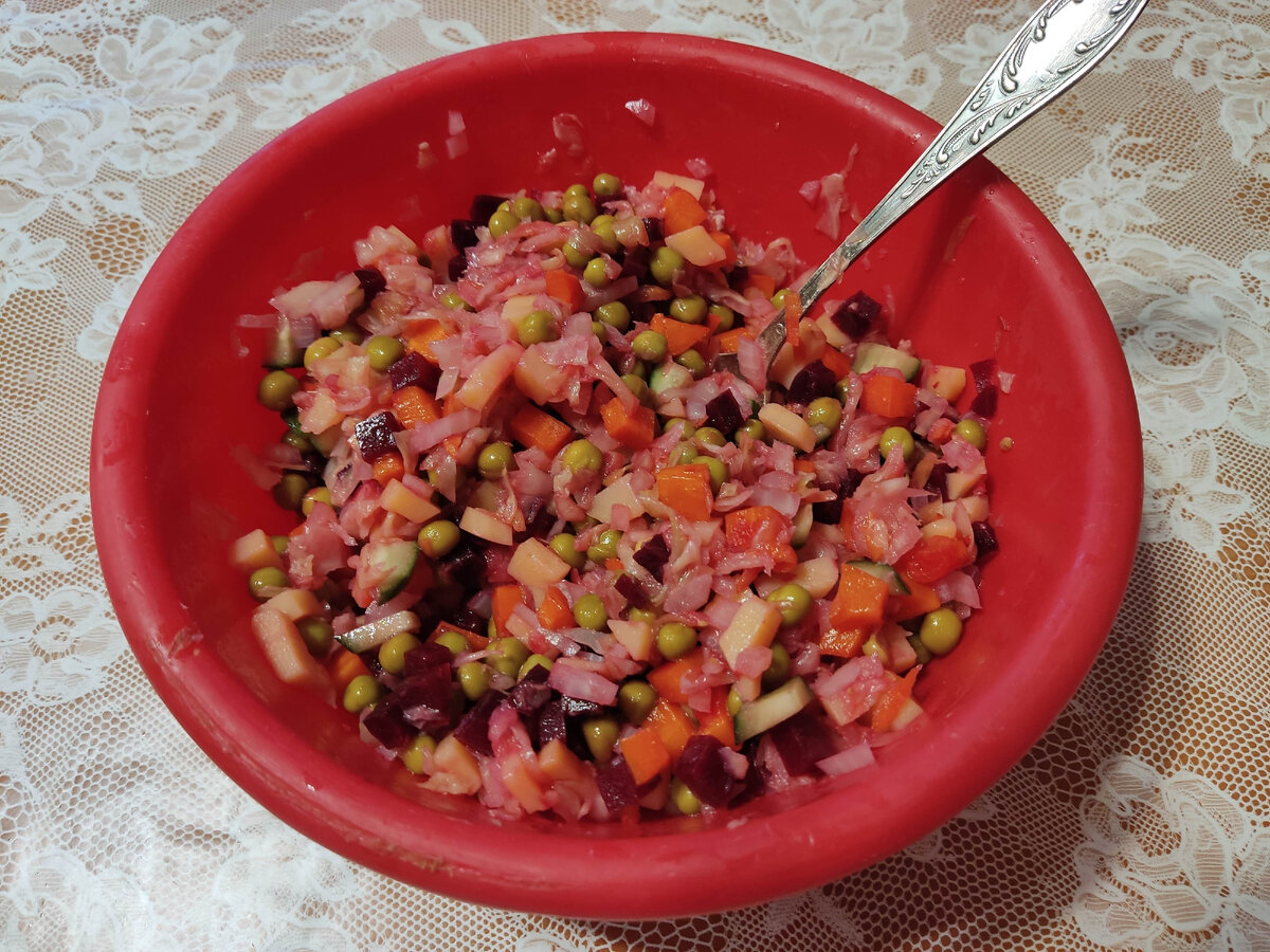 Любите ли Вы винегрет, так как не люблю его я? С детства восторгов по поводу этого салата я не испытывала. Когда начались суровые 90-ые, зарплату не платили по полгода, через полгода выплачивали, но уже деньги ничего не стоили. Винегрет занял практически главное место в меню, всех тех, кто пытался выжить с огорода. Таких, как я, в то время, много нас было. Один мой знакомый сказал тогда, а я запомнила на всю жизнь: — Наверное, очень бедный человек придумал этот салат. Долго я его не готовила, от слова совсем. Сейчас готовлю два раза, максимум, в год. Я подвержена приступам: 1) Экономный приступ бывает часто, начинаю экономить, считаю, записываю, ищу, где дешевле. Самое большое я в этом режиме смогла прожить год. Надоело до ужаса. 2) Похудательный приступ ко мне приходит после нового года и перед отпуском, когда собираюсь в теплые края. После нового года срочно убрать нажратое, раз не могу похудеть, то нужно стараться не толстеть хотя бы. А перед отпуском, тут все понятно, хочется быть