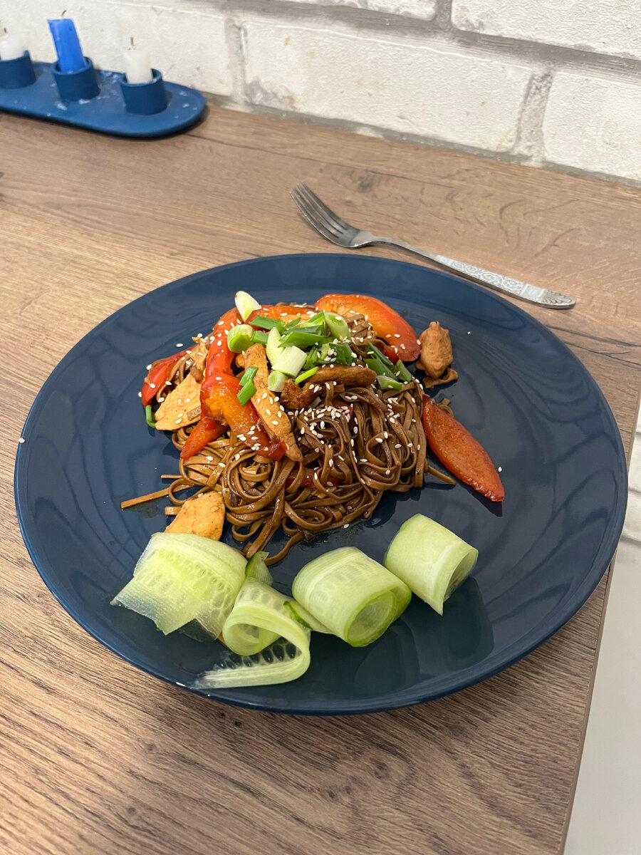 Очень вкусно получается и очень быстро🤤 Рецепт: Нарезаем курочку на удлиненные кусочки, затем обжариваем на растительном масле минут 10, добавляем так же нарезанный болгарский перец и лук мелко порезанный , тушим еще минут 10, одновременно ставим воду на лапшу, варить ее 1 минуту и потом под холодную воду, в курочку добавляем терияки и соевый соус примерно по три столовой ложки , даем закипеть и кладем нашу лапшу, все это перемешать и подождать минуты 3) при подаче посыпать кунжутом и нарезанным зеленым лучком) Это очень вкусно и необычно, попробуйте обязательно 🫶, подписывайтесь и задавайте ваши вопросы в комментариях) Всем добра 🧡