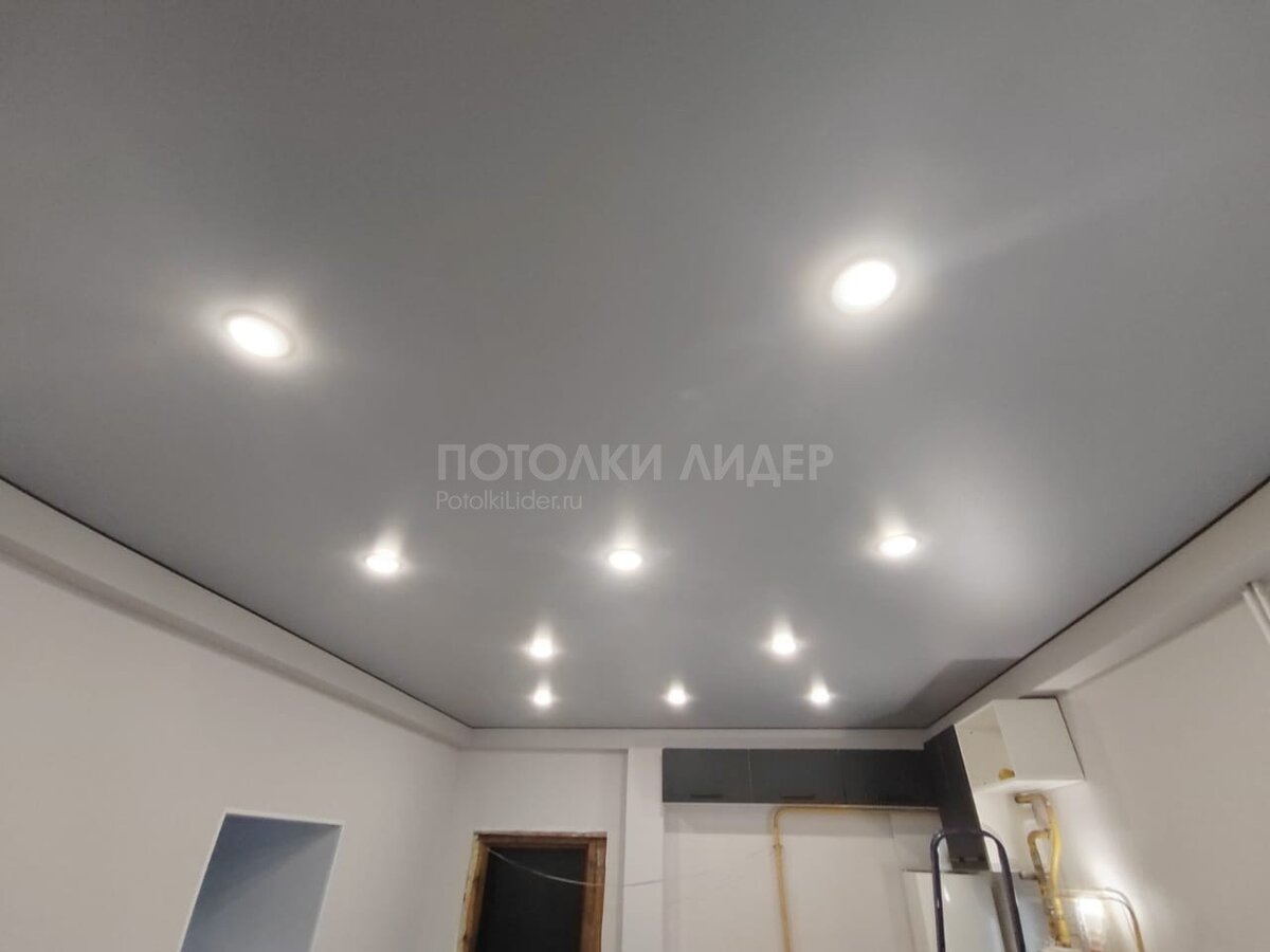 Ещё пример, простых, одноуровневых, но уже глянцевых серых натяжных потолков: