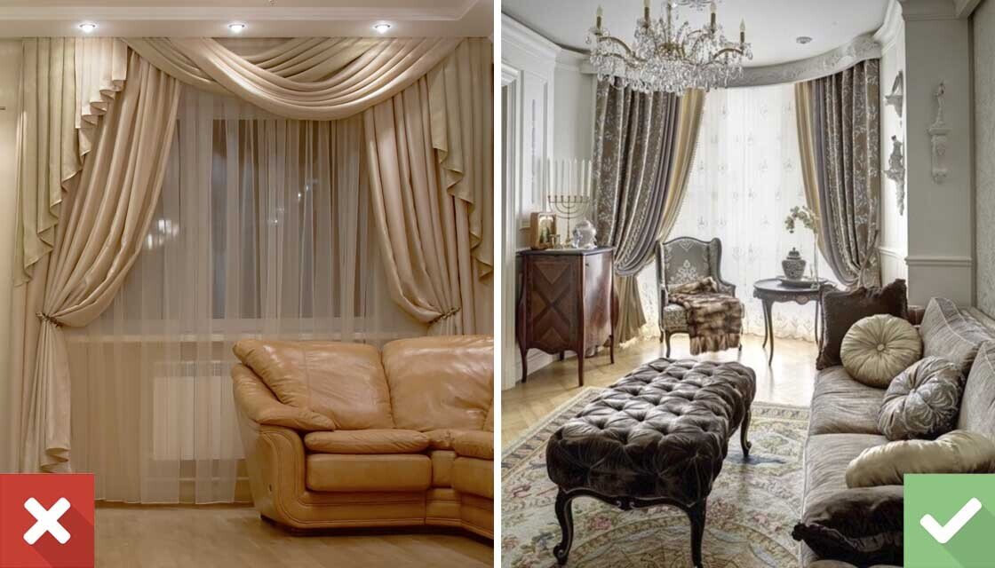 В дворцовых интерьерах сложносочиненные роскошные шторы, с ламбрекенами и кистями, выглядят как произведение искусства. Но в маленькой комнате, часто с низкими потолками, они смотрятся как герцогиня Кембриджская на распродаже в Ленте. В 90-х такие портьеры были атрибутом роскоши и люди, недавно сутки стоявшие в очереди за бананами, пустились во все тяжкие и украшали себя и квартиры всем лучшим и сразу. Сейчас уже можно успокоиться и не демонстрировать свой достаток, используя дворцовую эстетику. В моде скромность, умеренность и минимализм – и именно это выглядит дорого. Синтетические шторы на окнах