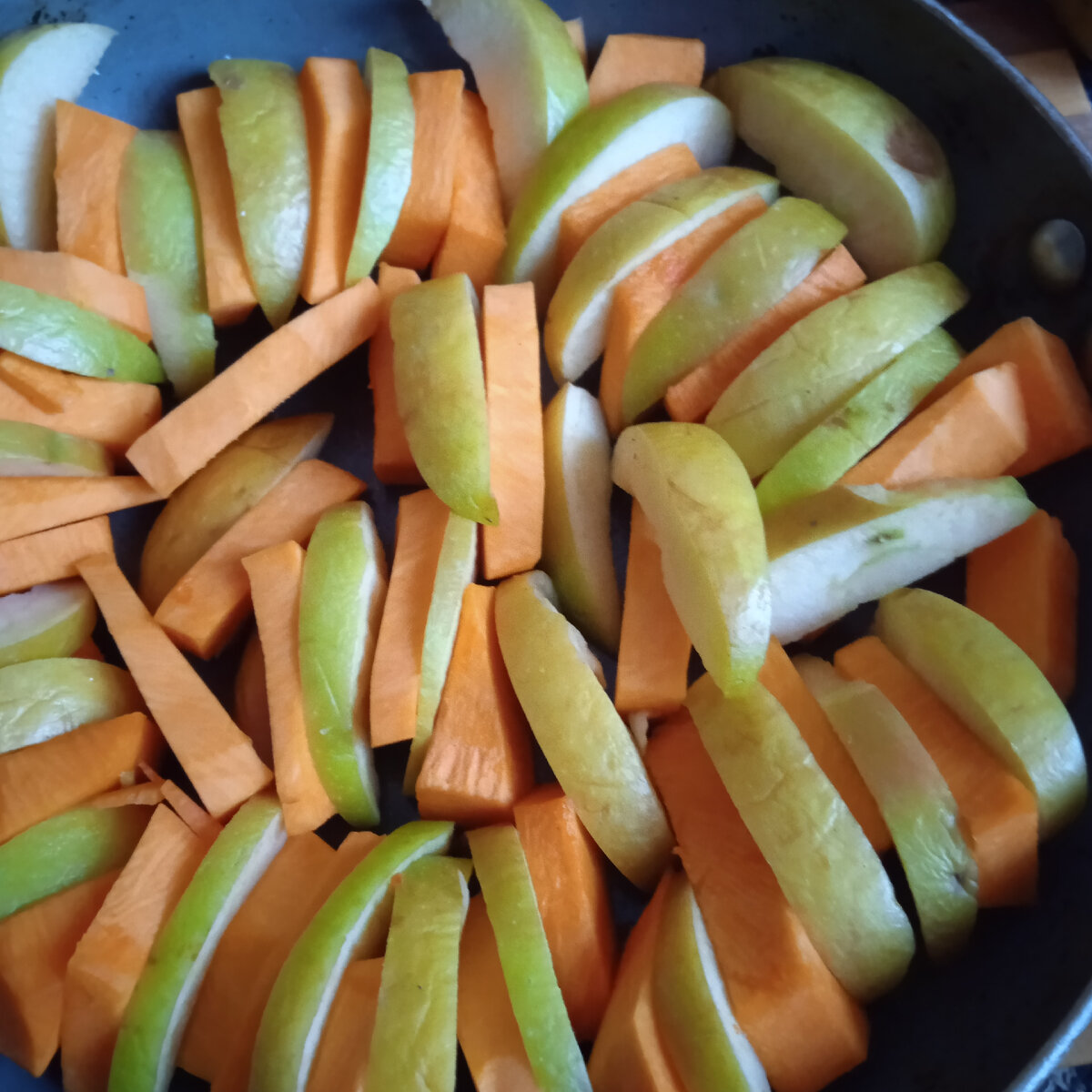 Не знаю, как вы , мои хорошие, а я за праздники малость "подросла". Может и не вся, а только некоторые части, но, что есть, то есть! Да , если честно, и поиздержалась! Поэтому возникло большое желание начать экономить, заодно и подхуднуть! Ну раз надо, значит -надо! Основные траты у меня на питание, значит с него и начнём, подумала я . Есть ещё один момент, который хорошо продырявил мой кошелёк- это заказы растений, но с ними покончено, надеюсь. Ну тогда и начнём , не будем ждать никаких понедельников. Достала небольшую тыкву, еле-еле разрезала её, очень плотная мякоть. Решила сообразить новый десерт. Нарезала дольками яблоки, какие остались после Нового года и так же дольками тыкву. Уложила в небольшой сотейник, остальную убрала в холодильник, она ещё пригодится. Затем посыпала её сахаром. Знаю, что надо бы без него, но и есть не буду, не вкусно же будет. Ну и это ещё не всё, сверху сдобрила сметанкой, потом добавила воды и поставила томиться. Вот так она аппетитно булькает. Когда