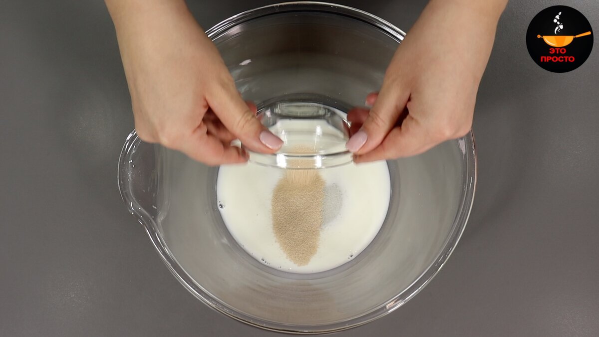 Для приготовления дрожжевого теста в миску выливаем 80 мл тёплого молока, добавляем 1 ст.л. сахара, 3 г сухих дрожжей. Перемешиваем венчиком, накрываем тонким полотенцем и даём дрожжам активироваться.