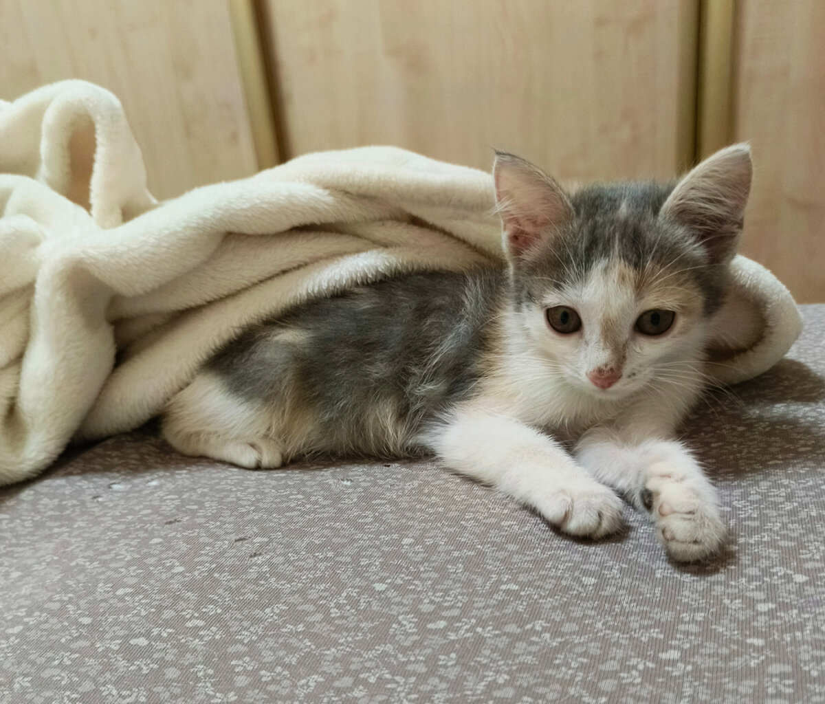 Первое - это мы набрали вес. В первый день Эльза весила 630 грамм, сегодня уже 870 грамм. Ест она очень хорошо. Взрослая кошка ест в разы меньше, но это и понятно, котенку надо расти.