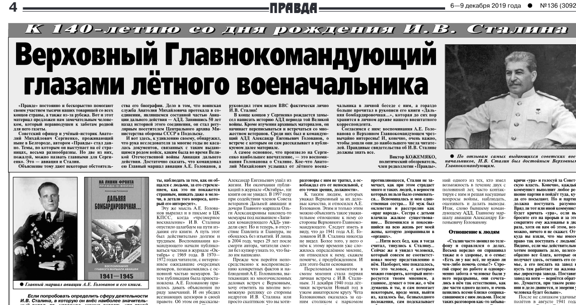 6 декабря день рождения у историка Анатолия Михайловича Сергиенко и в этот день 2019 газета «Правда» сделала ему подарок: наконец-то начала публиковать его статью под названием «Верховный Главнокомандующий глазами лётного военачальника».