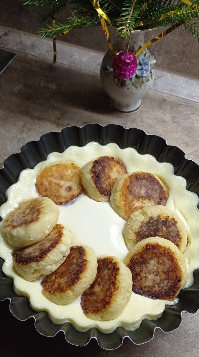 К этому времени поджарились творожники и выкладываем их в форму с заливкой, и ставим в духовку 180 градусов на 20 минут.