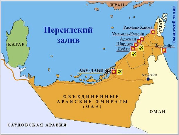 Арабские Эмираты или по-простому Эмираты расположены на Аравийском полуострове. Земли их – пустынная равнина, но кое-где есть оазисы. Вот по числу древних оазисов и появились там небольшие государства со своими военачальниками-повелителями и величались они по-арабски эмирами, земля же подвластная эмиру называлась Эмиратом. Семь Эмиратов там было, да и сейчас они есть: Абу-Даби, Дубаи, Шарджа, Фуджейра, Аджман, Рас-эль-Хайма и Умм-эль-Кувейн.