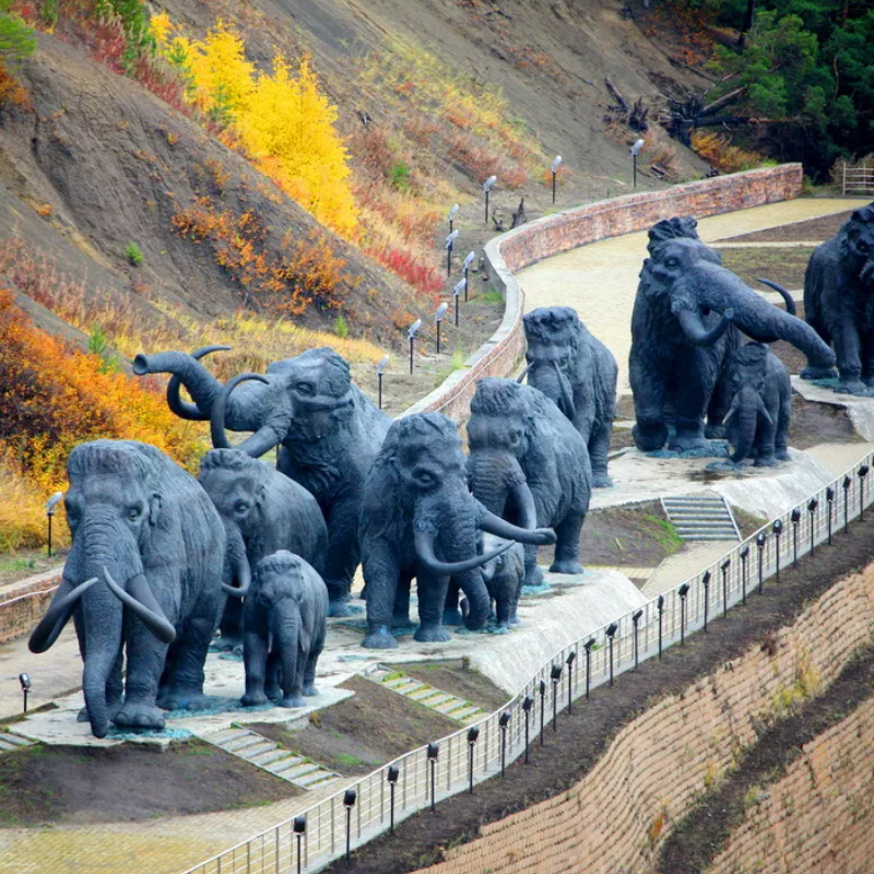Скульптурная композиция «Мамонты» появилась в Ханты-Мансийске в 2007 году. Создание данного памятника было приурочено к 425-летию столицы Ханты-Мансийского автономного округа. Скульптура находится на территории знаменитого Археопарка. Скульптурная композиция состоит из 7 бронзовых памятников. Общий вес этих памятников превышает отметку в 70 тонн. В 2009 году у скульптуры появилось пополнение и количество мамонтов стало 11. Все памятники установлены в натуральную величину. Высота самого высокого мамонта превышает 8 метров, а самый маленький мамонт в высоту составляет всего лишь 3 метра. Скульптурная композиция «Мамонты» является визитной карточкой города, поэтому это место пользуется особым спросом среди туристов. Здесь очень любят фотографироваться вечером, потому что мамонты подсвечиваются всеми цветами радуги и получается очень красивая композиция. Архитектором стал небезызвестный народный художник России А. Ковальчук. Место для размещения скульптурной композиции было выбрано неслуча