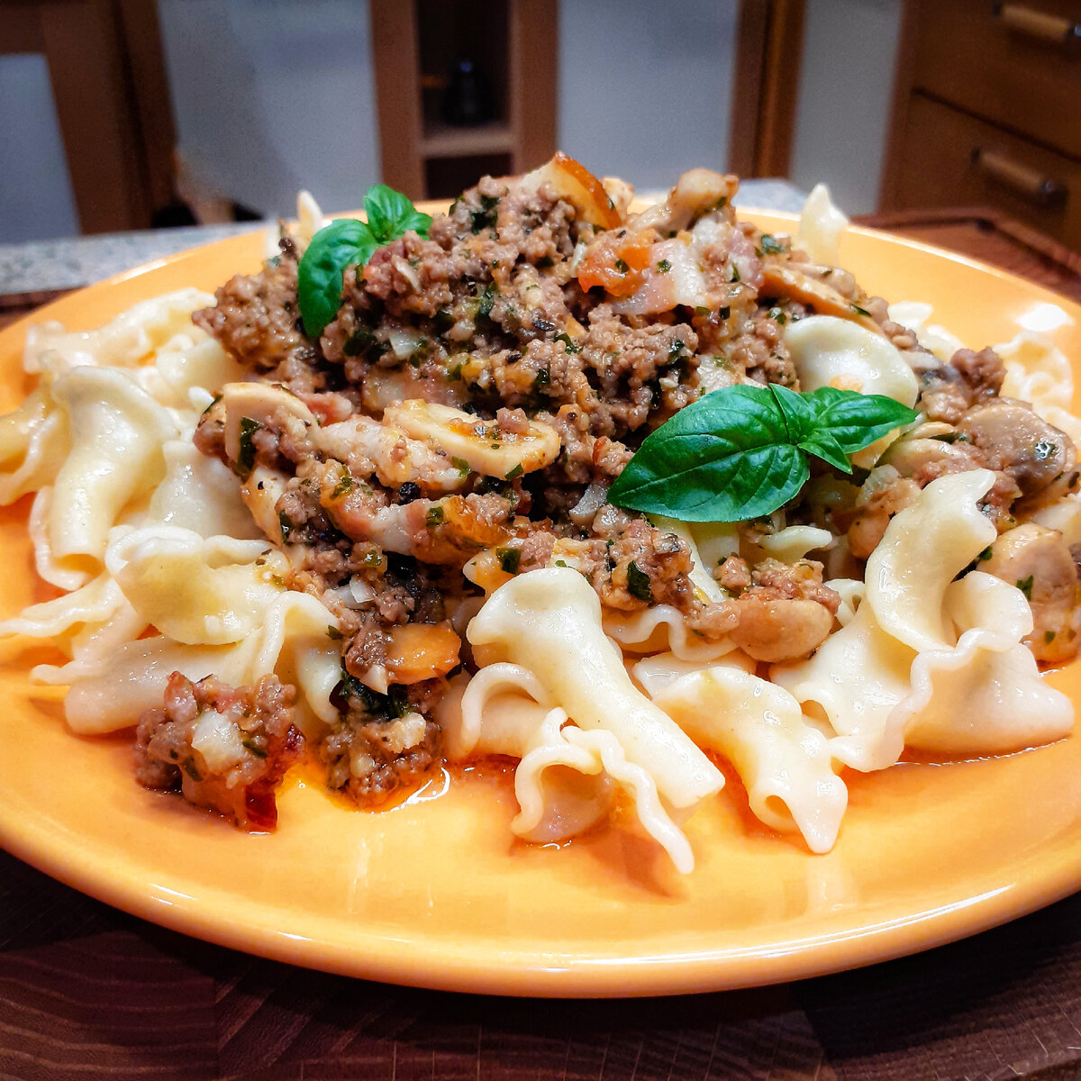 2. Теперь чеснок, шампиньоны, бекон, перемешиваем, добавляем орегано, жарим еще 2-3 минуты.