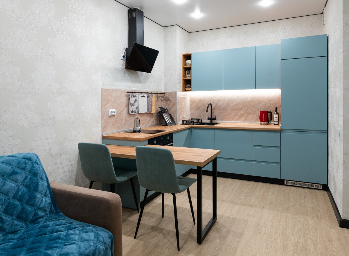 Установили небольшую кухню на Советской, 2. Жилой комплекс «АКВИЛОН REKA» Современная планировка квартиры часто подразумевает совмещение кухни и гостиной. И встает вопрос: как зонировать комнату, что бы была удобная зона приготовления пищи, комфортная обеденная зона и зона отдыха? Ответ в нашем новом проекте – небольшой кухне на Советской, 2. ЖК «АКВИЛОН REKA». Ее размер: 2630/2310 мм. Для изготовления мы использовали сочетание корпуса ЛДСП Ламарти в оттенке "Дуб Вотан" и фасадов МДФ в оттенке " Антарктида". Пастельный серо-бирюзовый оттенок — прекрасный выбор, когда хочется чего-то необычного, но не яркого. Идеальным дополнением служит столешница КЕДР в древесном декоре "Дуб классический" — она привносит чуточку тепла и уюта. Размер кухни не отразился на ее вместительности. Угловая планировка значительно увеличила рабочую поверхность и систему хранения. Основная бытовая техника встроена и эргономично размещена. Это сохраняет эстетичный внешний вид кухни и создает комфортные условия д